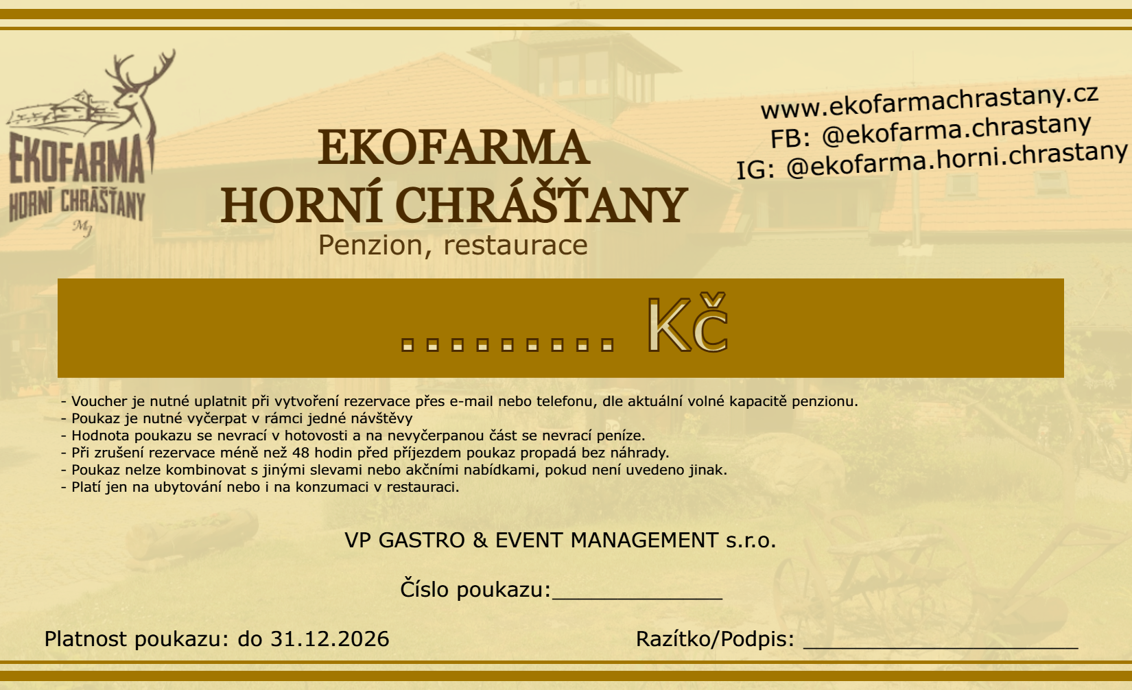 Přemýšlíte čím udělat radost lidem, na kterých vám záleží? Co takhle pobyt na unikátní ekofarmě zasazené do krásné přírody jižních Čech! Obdarovaní se mohou těšit na ubytování v komfortních a moderních pokojích, výbornou restauraci, ve které používáme zdroje z vlastní farmy, vlastní pivovar, několik výběhů s daňky, jeleny, pštrosy a další zvěří, koupací jezírko a mnoho dalšího!